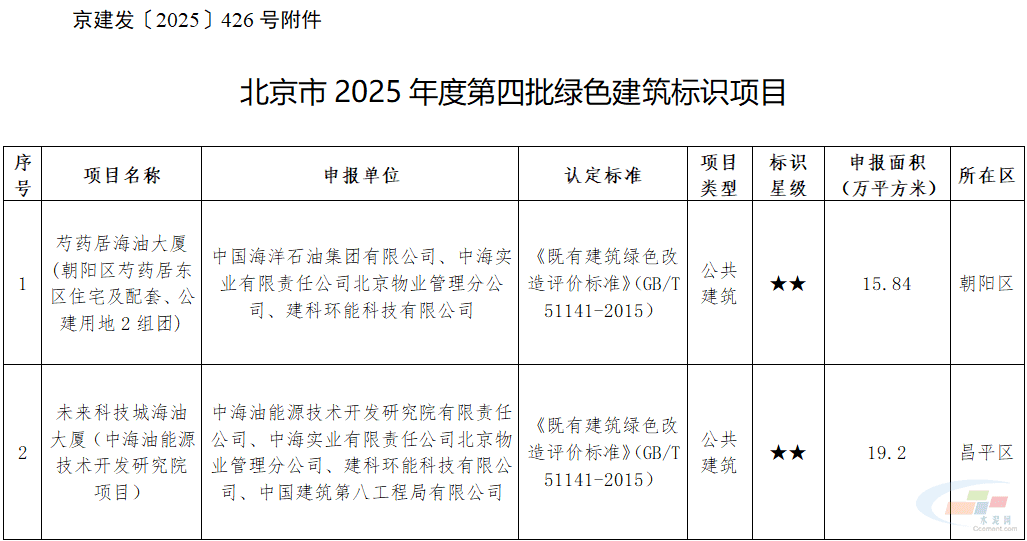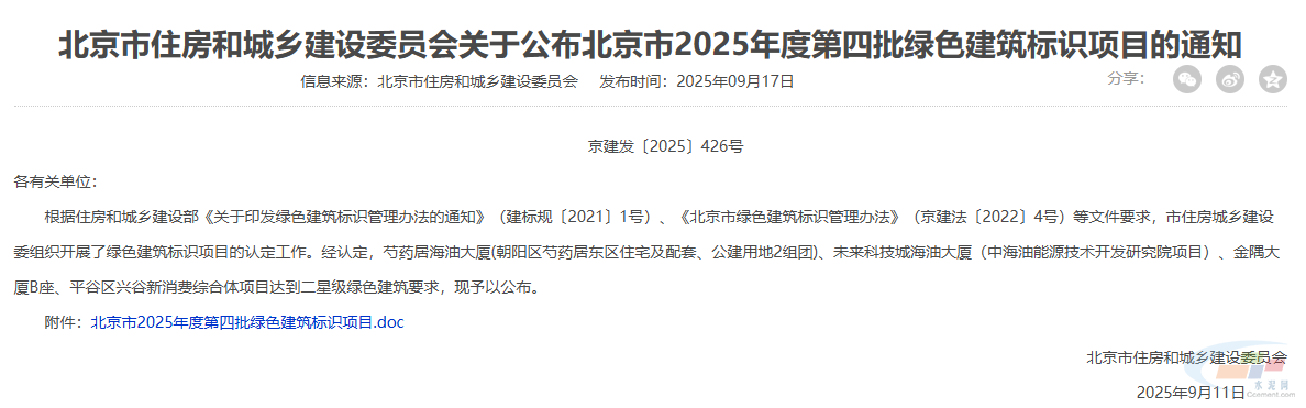 9月17日, 北京市住房和城乡建设委员会发布一则关于公布北京市2025年度第四批绿色建筑标识项目的通知。