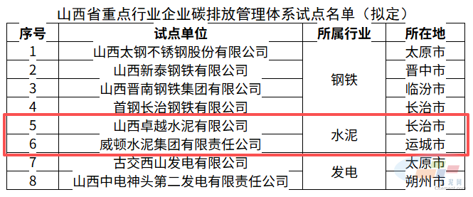 据拟定名单显示,本次公示的山西省重点行业企业碳排放管理体系试点企业中有2家水泥企业,分别是山西卓越水泥有限公司和威顿水泥集团有限责任公司。