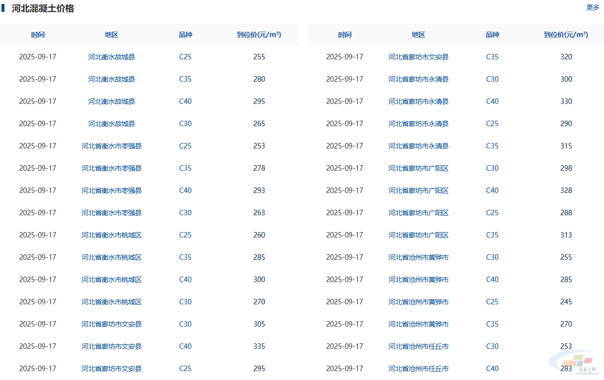 河北省内C30混凝土的市场价格区间在232元/方至255元/方之间,显示出一定的地区差异。