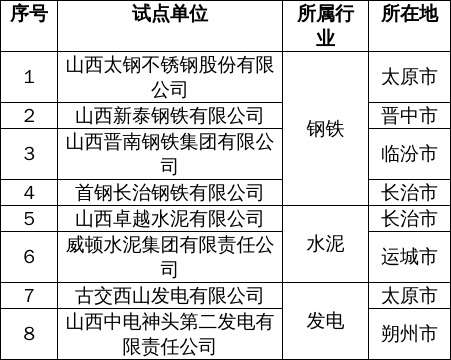 关于山西省重点行业企业碳排放管理体系试点 名单(拟定)的公示