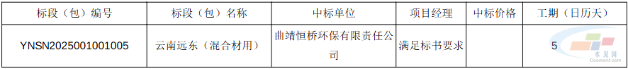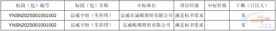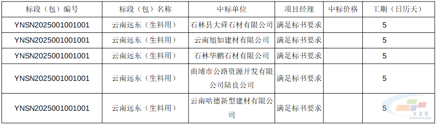 共有3个标段公布中标结果,标段分别为:云南远东(生料用)YNSN2025001001001、宣威宇恒(生料用)YNSN2025001001002、云南远东(混合材用)YNSN2025001001005。
