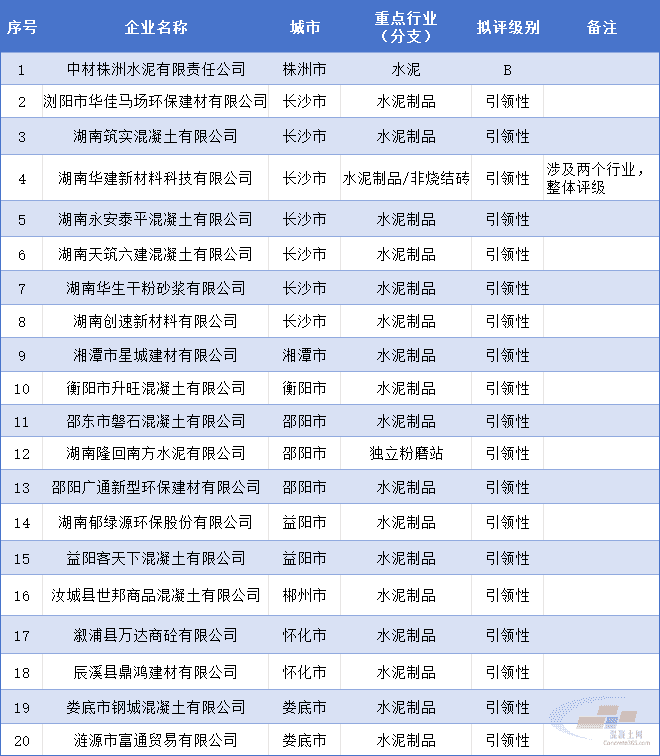名单显示,全省2025年第二批新增评定A、B级及引领性企业92家,其中,重点行业(分支)与水泥、混凝土相关的有20家企业,拟评级别为B的1家,是中材株洲水泥有限责任公司;拟评级别为引领性的有浏阳市华佳马场环保建材有限公司、湖南筑实混凝土有限公司、湖南华建新材料科技有限公司等19家。