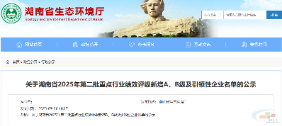 近日,湖南省生态环境厅发布了关于湖南省2025年第二批重点行业绩效评级新增A、B级及引领性企业名单的公示,公示期为2025年9月16日-2025年9月22日。