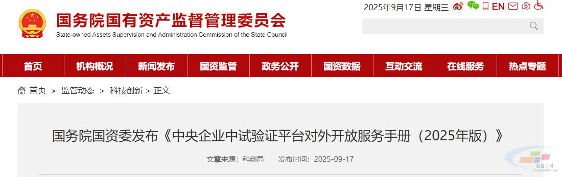 9月17日,国务院国资委科创局发布了《中央企业中试验证平台对外开放服务手册(2025年版)》。