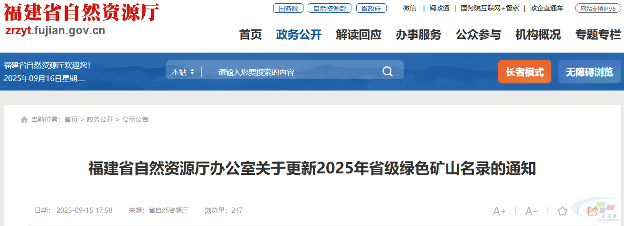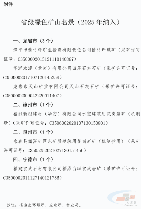 近日,福建省自然资源厅办公室发布了关于更新2025年省级绿色矿山名录的通知。