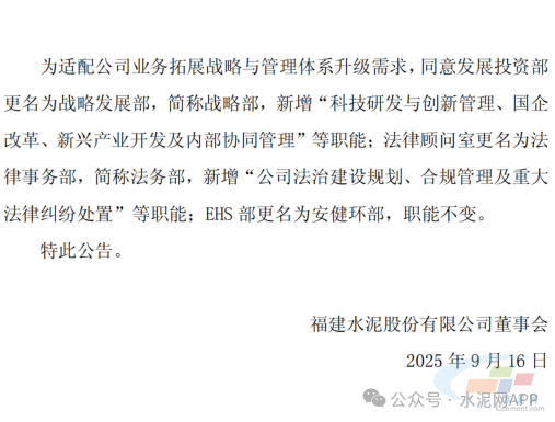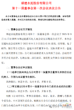 9月15日,福建水泥发布公告,选举王振兴同志为公司第十一届董事会董事长并担任法定代表人,任期与本届董事会相同。