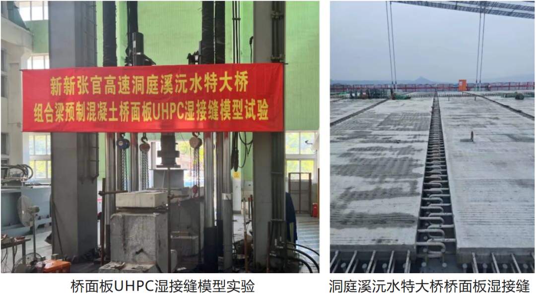 为解决传统湿接缝性能不足、接缝混凝土作业量大等问题,桥科院UHPC技术团队开展了组合梁预制混凝土桥面板UHPC湿接缝模型试验,针对性研发了低收缩高稳态UCA100型粗骨料UHPC,通过6组足尺板带模型对比试验验证了湿接缝优化构造的可靠性,大幅减小了接缝宽度、简化了钢筋连接构造,实现了接缝钢筋免焊施工,显著提高了湿接缝浇筑的施工质量和效率。