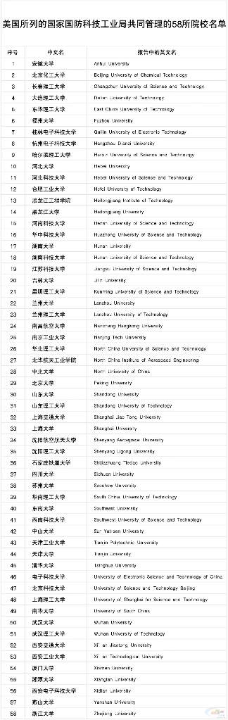 此次被列入“黑名单”的58所中国高校名单具体如下:
