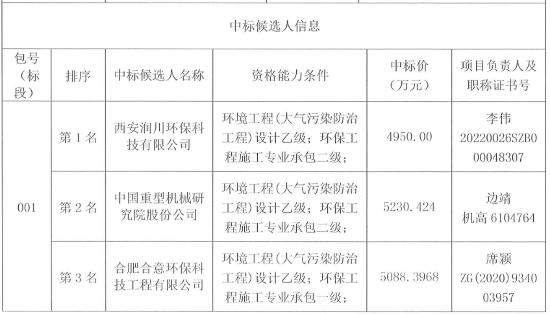 中标候选人第一名:西安润川环保科技有限公司,投标报价:4950万元;