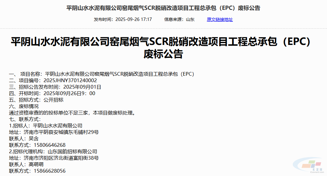 9月26日,平阴山水水泥有限公司窑尾烟气SCR脱硝改造项目工程总承包(EPC)废标公告发布。因通过资格审查的投标单位不足三家,本项目做废标处理。