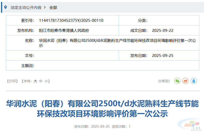 近日,广东省阳江市阳春市春湾镇人民政府网站发布了华润水泥(阳春)有限公司2500t/d水泥熟料生产线节能环保技改项目环境影响评价第一次公示。