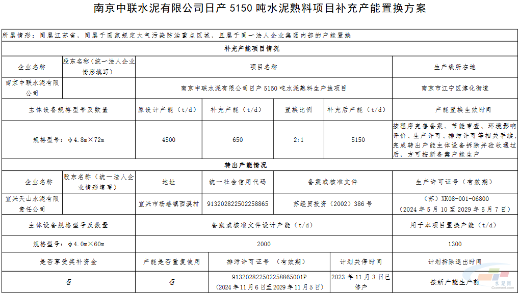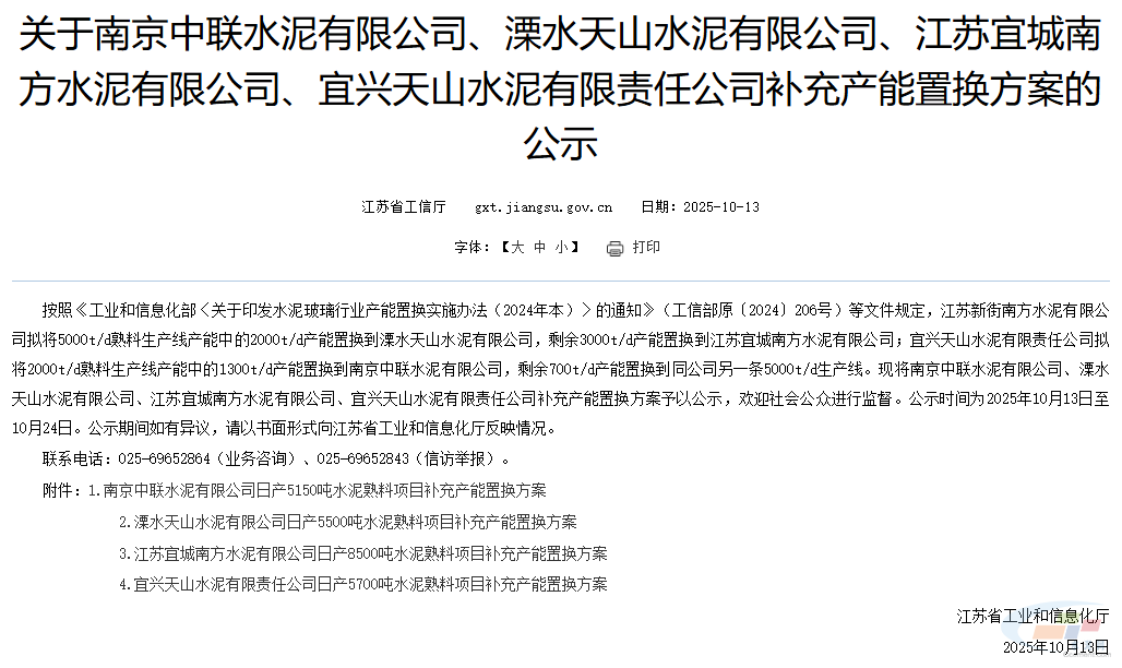 10月13日,江苏省工业和信息化厅发布关于南京中联水泥有限公司、溧水天山水泥有限公司、江苏宜城南方水泥有限公司、宜兴天山水泥有限责任公司补充产能置换方案的公示,公示时间为2025年10月13日至10月24日。