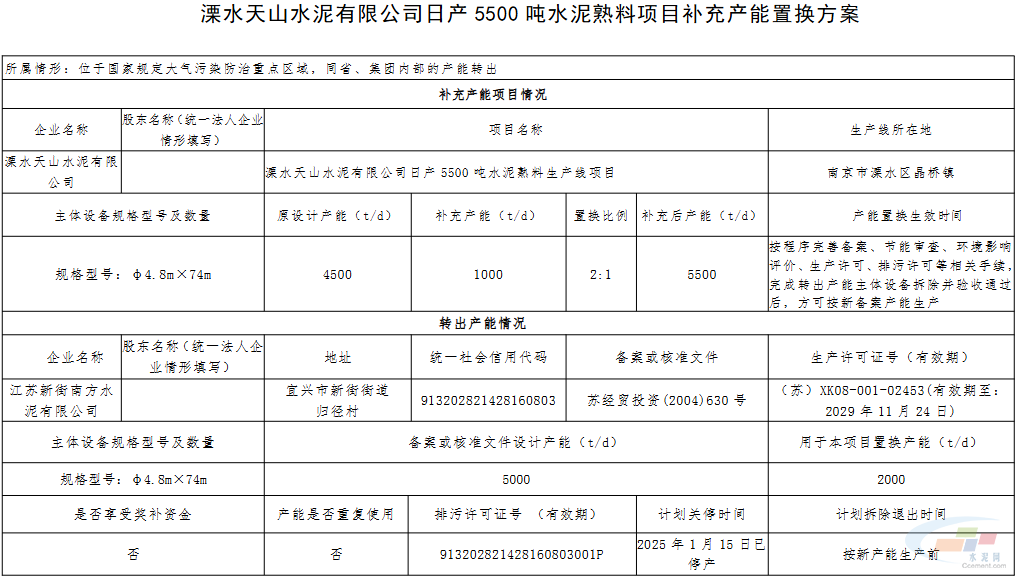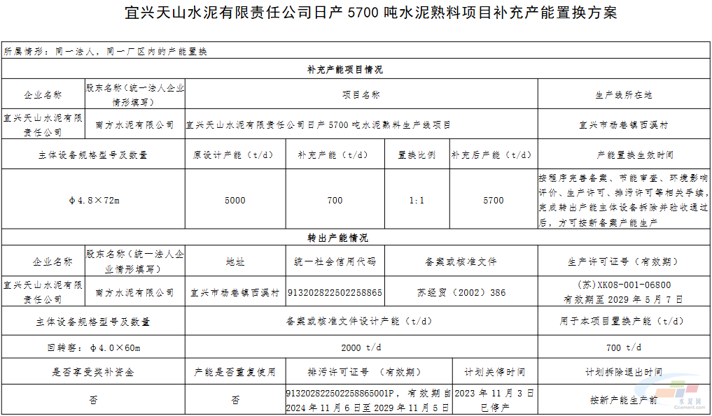 公示显示,江苏新街南方水泥有限公司拟将5000t/d熟料生产线产能中的2000t/d产能置换到溧水天山水泥有限公司,剩余3000t/d产能置换到江苏宜城南方水泥有限公司;宜兴天山水泥有限责任公司拟将2000t/d熟料生产线产能中的1300t/d产能置换到南京中联水泥有限公司,剩余700t/d产能置换到同公司另一条5000t/d生产线。