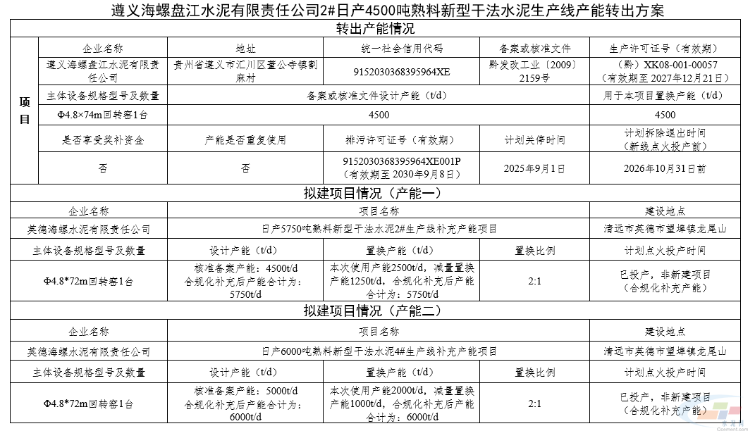 10月11日,贵州省工信厅发布《关于遵义海螺盘江水泥有限责任公司2#日产4500吨熟料新型干法水泥生产线产能转出方案的公告》。《公告》显示,遵义海螺盘江4500t/d生产线产能指标分两部分置换到英德海螺两条熟料生产线。遵义海螺盘江4500t/d熟料生产线2025年9月1日关停,计划2026年10月31日前拆除。