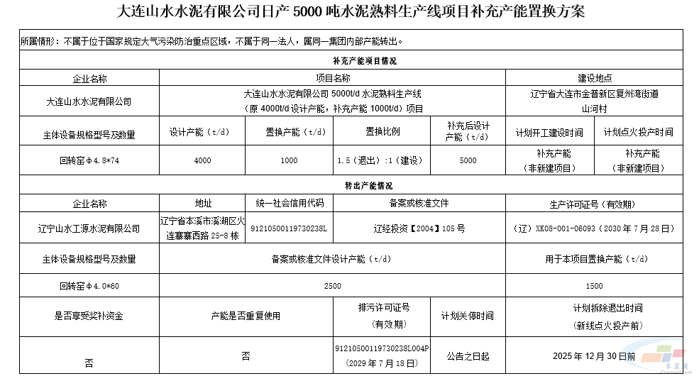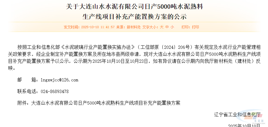 建材科普 大连山水5000t/d熟料生产线补充产能 金峰建材 2026-03-22 2026-03-22 10月10日,辽宁省工业和信息化厅发布《关于大连山水水泥有限公司日产5000吨水泥熟料生产线项目补充产能置换方案的公示》,大连山水将按照1.5:1补充1000t/d产能,指标来源为辽宁山水工源水泥有限公司。 分享本文: 本文链接:https://www.jfxiyou.com/hangyeshiye/1920.html