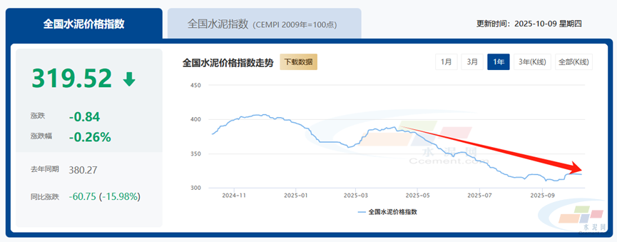 今年,国内是水泥行情呈现明显的高开低走趋势,中国水泥网全国水泥价格指数年初以来几乎一路下行。截止到10月9日,全国水泥价格指数319.52点,较去年同期跌60.75点(即当前全国水泥均价较去年同期低约60元/吨),跌幅15.98%。