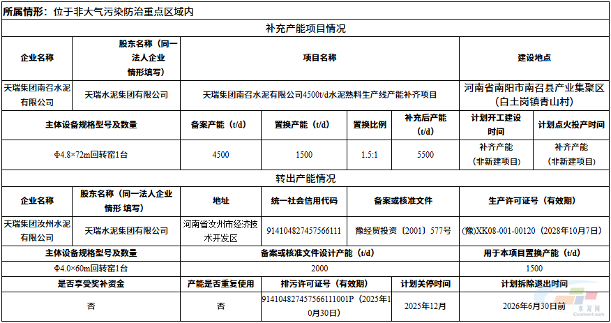 根据公示,天瑞集团南召水泥有限公司4500t/d水泥熟料生产线产能补齐项目置换产能1500t/d,补充后产能5500t/d,置换比例为1.5:1。天瑞集团汝州水泥有限公司2000t/d熟料生产线中的1500t/d用于本项目置换产能,计划2026年6月30日前拆除退出。