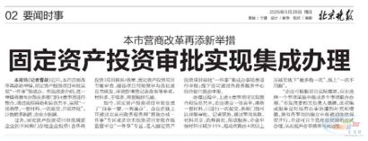 近日,《北京晚报》报道了北京市营商改革再添新举措,固定资产投资项目审批实现“一件事”集成办。将原本分散在多部门的4类事项进行整合,通过流程再造和信息共享,实现“一张表单、一套材料、一次提交、并联审批”,让数据多跑路、企业少跑腿。