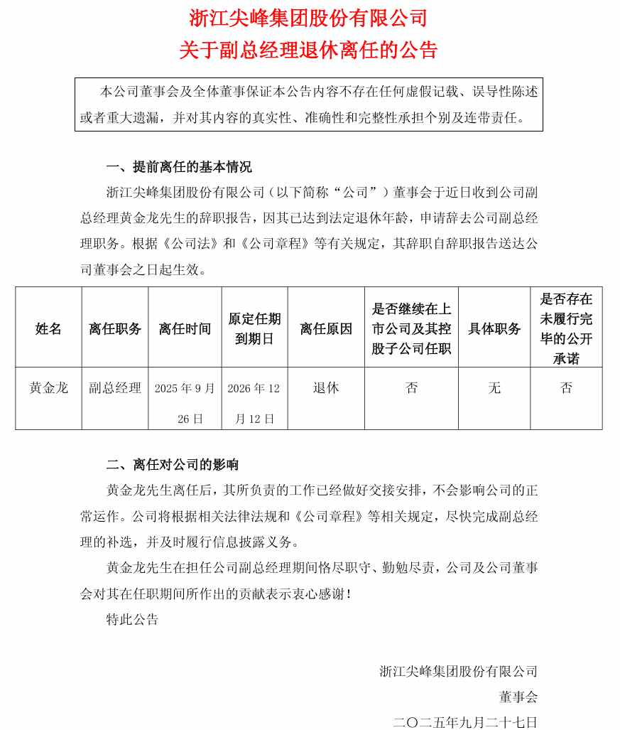 建材科普 尖峰集团:副总经理黄金龙辞职 金峰建材 2026-03-24 2026-03-24 近日,尖峰集团公告,副总经理黄金龙因达到法定退休年龄,于2025年9月26日提交辞职报告,其辞职自报告送达公司董事会之日起生效。黄金龙先生原定任期至2026年12月12日。公司计划按照相关规定尽快完成新副总经理的补选。 分享本文: 本文链接:https://www.jfxiyou.com/hangyeshiye/2099.html