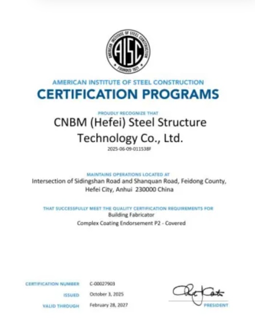 02中建材钢构公司通过美国钢结构协会(AISC)认证
