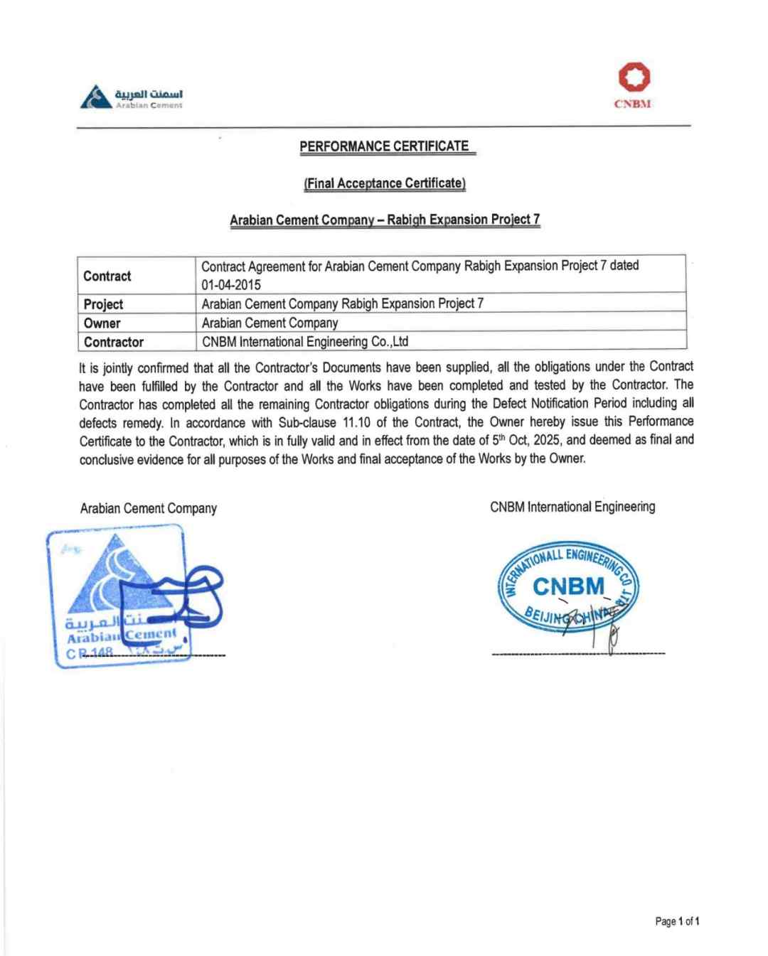 近日,沙特拉比格ACC粉磨站项目获得业主颁发的FAC证书,标志着该项目顺利完成设备质保阶段,实现完美收官。