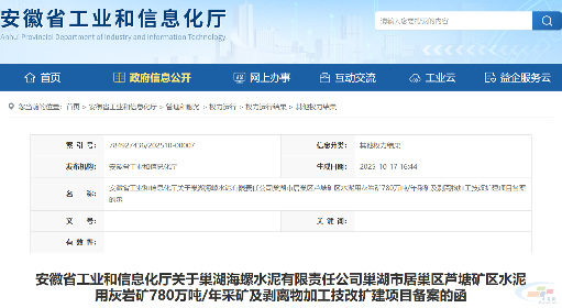 近日,安徽省工业和信息化厅发布关于巢湖海螺水泥有限责任公司巢湖市居巢区芦塘矿区水泥用灰岩矿780万吨/年采矿及剥离物加工技改扩建项目备案的函。