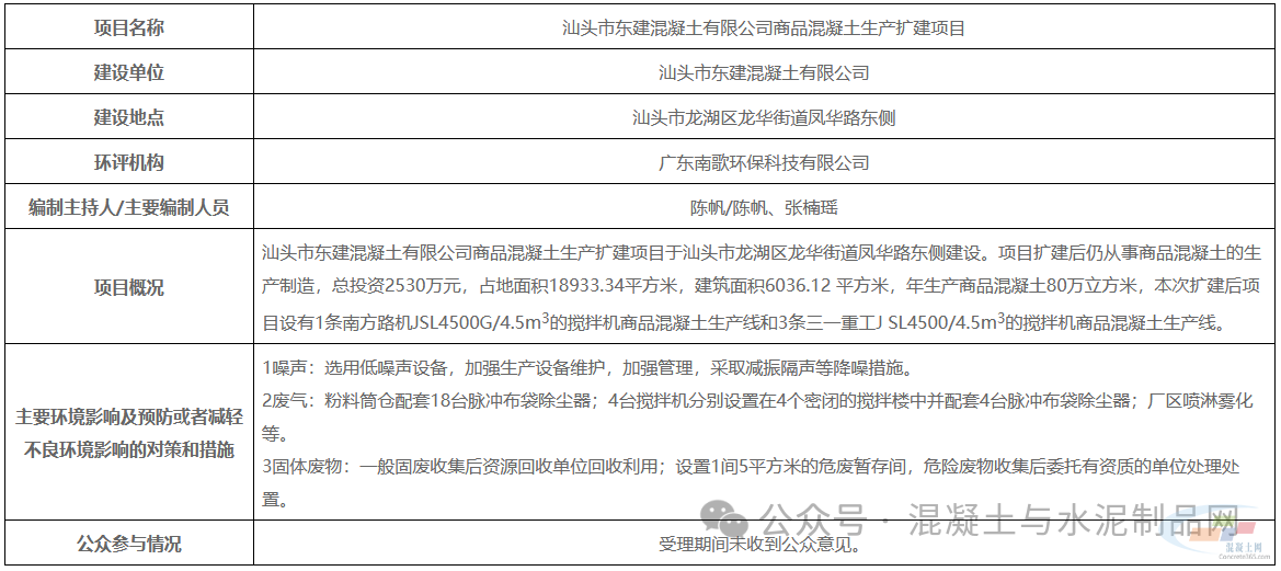 据介绍,汕头市东建混凝土有限公司商品混凝土生产扩建项目于汕头市龙湖区龙华街道凤华路东侧建设。