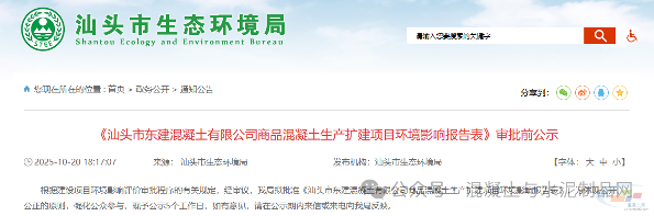 10月20日,广东汕头市生态环境局发布“《汕头市东建混凝土有限公司商品混凝土生产扩建项目环境影响报告表》审批前公示”。