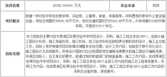 项目名称:蒸湘区松亭实验中学项目设计、采购、施工工程总承包(EPC)