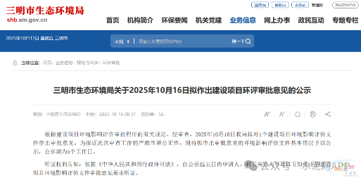10月16日,福建省三明市生态环境局发布“关于2025年10月16日拟作出建设项目环评审批意见的公示”。根据建设项目环境影响评价审批程序的有关规定,经审查,2025年10月16日我局拟对1个建设项目环境影响评价文件作出审批意见。