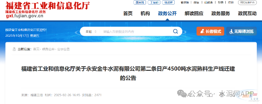 因生态保护要求等导致配套矿山无法满足生产需要,永安金牛水泥有限公司第二条日产4500吨水泥熟料生产线拟从三明市永安市迁址至三明市宁化县湖村镇建设,该事项经工业和信息化部确认符合相关产业政策,同时,项目实施主体由永安金牛水泥有限公司变更为宁化金牛水泥有限公司(二者均属于福建金牛水泥集团,实际控制人没有变化)。根据《工业和信息化部关于印发 < 水泥玻璃行业产能置换实施办法(2024年本)>的通知》(工信部原〔2024〕206 号)要求,现予以公告。