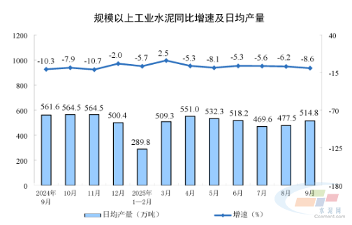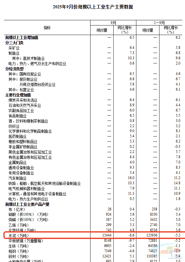 其中水泥行业9月份全国水泥产量15444万吨,下降8.6%;1-9月全国水泥产量125936万吨,同比下降5.2%。