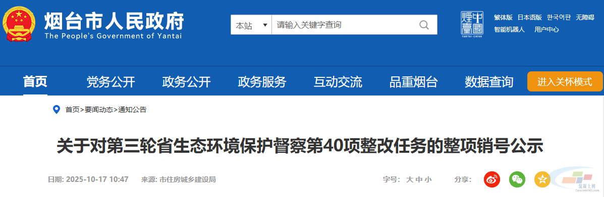 10月17日,山东省烟台市住房城乡建设局发布关于对第三轮省生态环境保护督察第40项整改任务的整项销号公示。