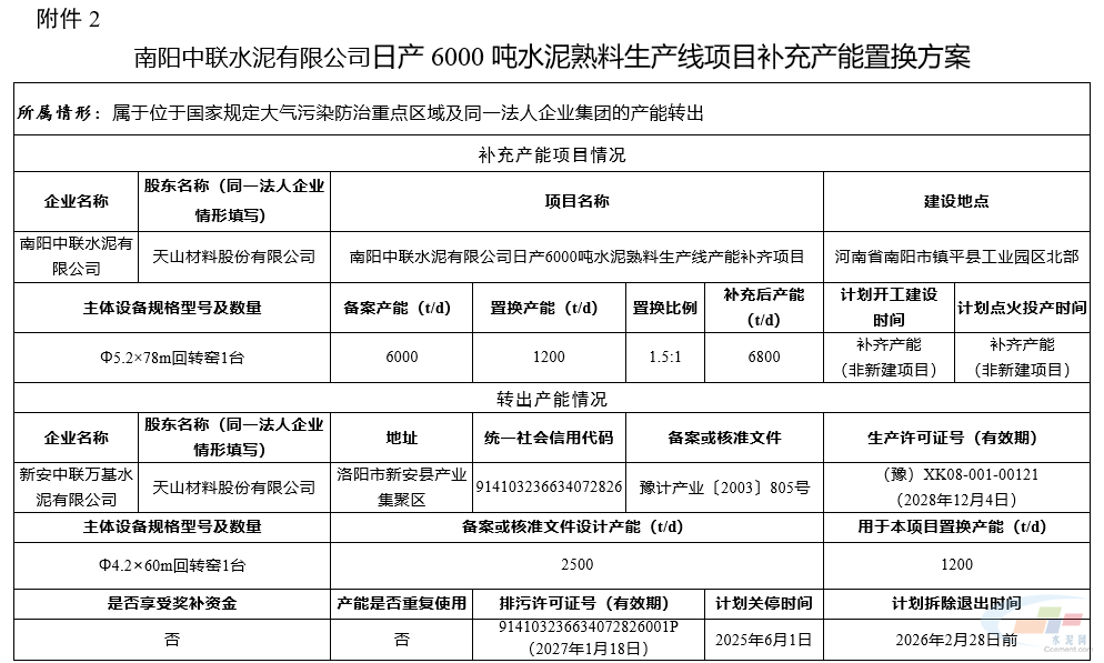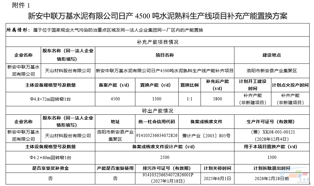 10月15日,河南省工信厅发布《关于新安中联万基水泥有限公司日产4500吨水泥熟料生产线项目及南阳中联水泥有限公司日产6000吨水泥熟料生产线项目补充产能置换方案的公告》。