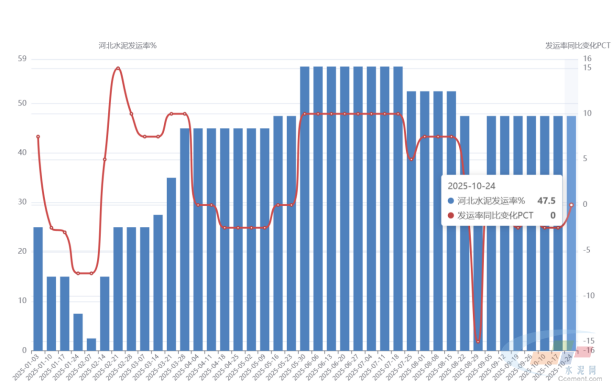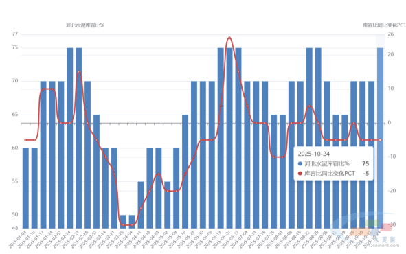 据水泥网大数据显示,当前河北区域水泥库存较高,库容比达到75%,近期内涨幅明显;需求端表现平平,河北水泥发运率47.5%。