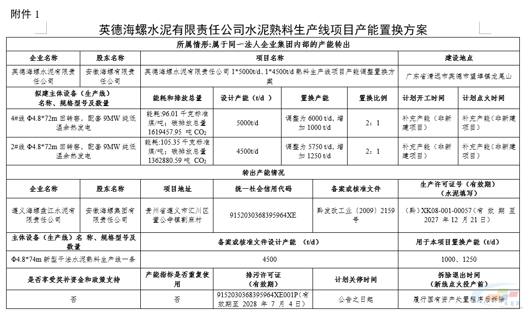 10月27日,广东省工信厅发布《广东省工业和信息化厅关于英德海螺水泥有限责任公司水泥熟料生产线项目产能置换方案的通告》,英德海螺水泥有限责任公司4#5000t/d熟料生产线和2#4500t/d熟料生产线将分别补充1000t/d和1250t/d产能,置换比例2:1,产能指标来源为遵义海螺盘江水泥有限责任公司4500t/d熟料线。