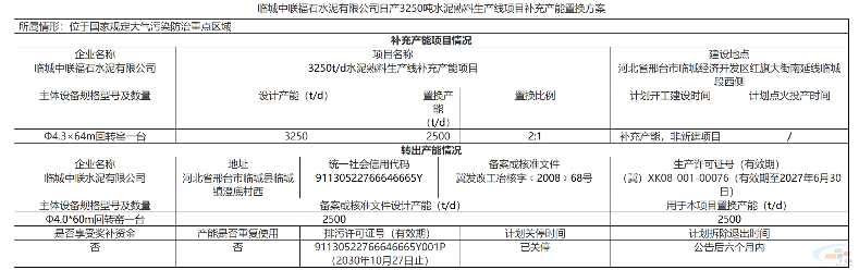 建材科普 临城中联福石水泥2500t/d熟料线补充产能 金峰建材 2026-04-03 2026-04-03 10月27日,河北省工信厅发布公示,临城中联福石水泥有限公司2500t/d水泥熟料生产线补充750t/d产能,置换比例2:1,产能指标来源为临城中联水泥有限公司2500t/d熟料线。 分享本文: 本文链接:https://www.jfxiyou.com/hangyeshiye/2778.html