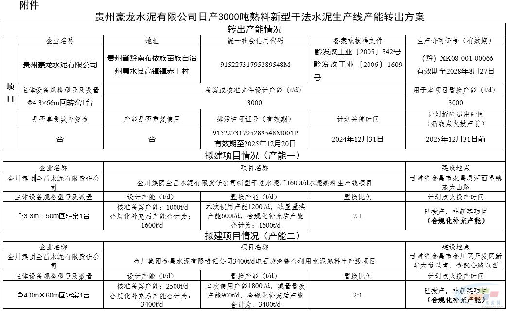 11月4日,贵州省工业和信息化厅发布《关于变更贵州豪龙水泥有限公司日产3000吨熟料新型干法水泥生产线产能转出方案的公示》,2025年2月11日公告的《关于贵州豪龙水泥有限公司日产3000吨熟料新型干法水泥生产线产能转出方案的公告》产能置换方案未实施。现对贵州豪龙水泥有限公司日产3000吨熟料新型干法水泥生产线产能转出方案变更进行公示,原公告方案失效。