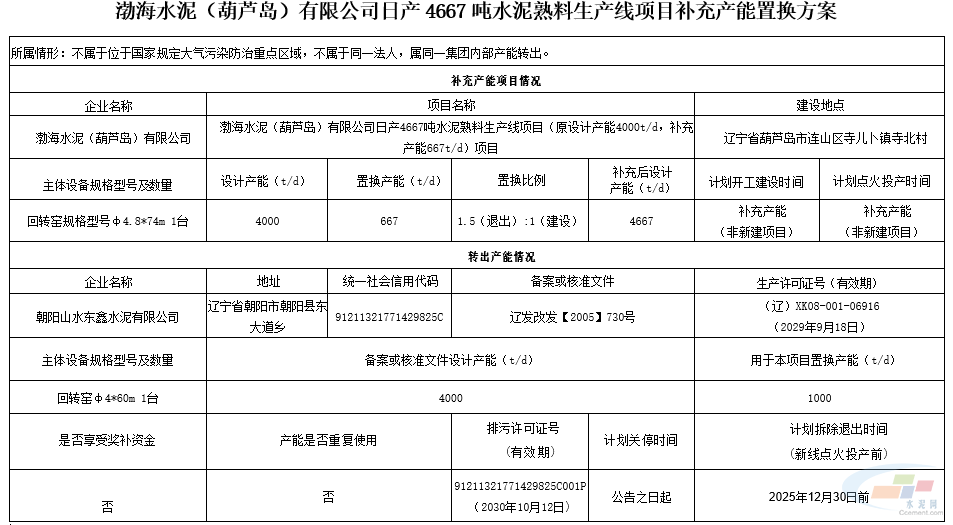 10月28日,辽宁省工业和信息化厅发布《关于渤海水泥(葫芦岛)有限公司日产4667吨水泥熟料生产线项目补充产能置换方案的公示》,渤海水泥(葫芦岛)有限公司4000t/d水泥熟料生产线补充667t/d产能,置换比例1.5:1,产能指标来源为朝阳山水东鑫水泥有限公司4000t/d线。