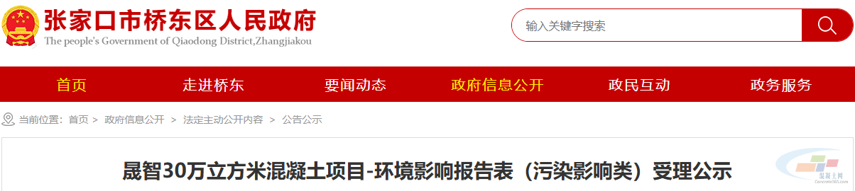 11月3日,河北省张家口市桥东区人民政府发布关于晟智30万立方米混凝土项目环评受理的公示。