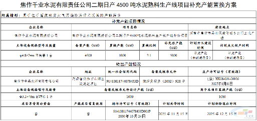 公示内容显示,焦作千业水泥有限责任公司二期4500t/d水泥熟料生产线项目补充产能500t/d,来自焦作市中晶水泥有限责任公司1000t/d熟料线,置换比例2:1,补充后产能为5000t/d。