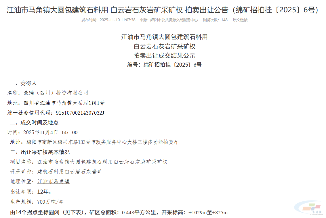 近日,相关资源交易平台信息显示,豪瑞(四川)投资有限公司成功竞得四川省绵阳市江油市马角镇大圆包建筑石料用白云岩石灰岩矿采矿权,成交价为13,798万元。
