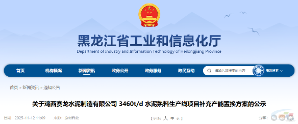 11月12日,黑龙江省工业和信息化厅发布关于鸡西赛龙水泥制造有限公司3460t/d水泥熟料生产线项目补充产能置换方案的公示。