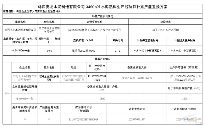 根据公示,智海企业集团榆次水泥有限公司出让1920t/d产能至鸡西赛龙水泥制造有限公司2500t/d熟料线,补充产能960t/d,补充后产能为3640t/d,置换比例2∶1。