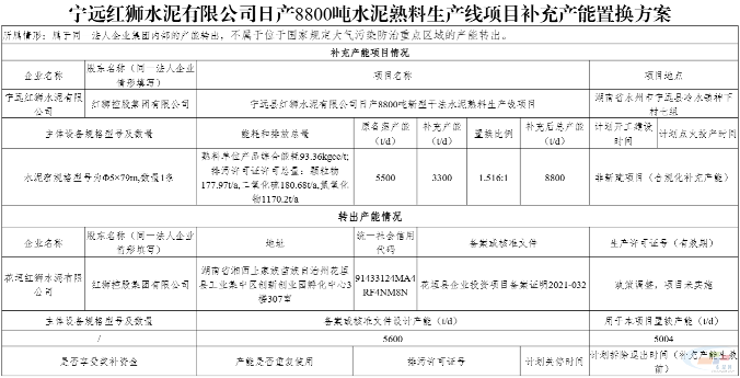 宁远红狮水泥8800t/d水泥熟料线项目补充产能置换方案公示