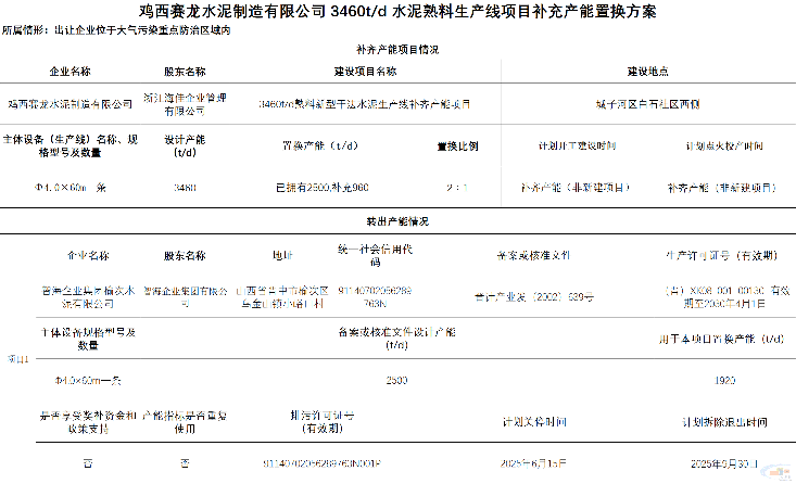 鸡西赛龙水泥制造有限公司2500t/d熟料线将按照2:1的置换比例,补充960t/d熟料产能,产能指标来源为智海企业集团榆次水泥有限公司2500t/d生产线中的1920t/d产能。
