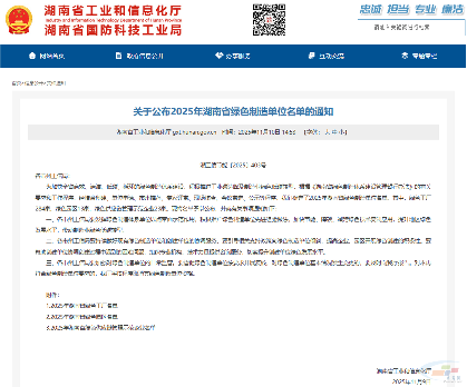 11月10日,湖南省工业和信息化厅发布“关于公布2025年湖南省绿色制造单位名单的通知”。