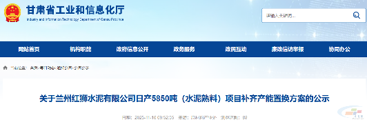 11月10日,甘肃省工信厅发布关于兰州红狮水泥有限公司日产5850吨(水泥熟料)项目补齐产能置换方案的公示,公示时间为2025年11月10日至11月21日(10个工作日)。