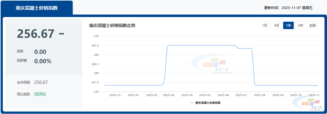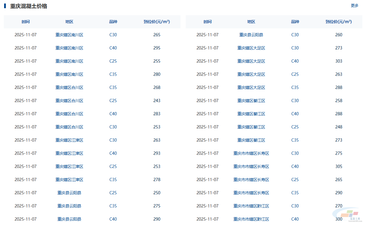中国混凝土网行情通显示,2025年11月10日重庆市热门区域C30混凝土市场价格如下: