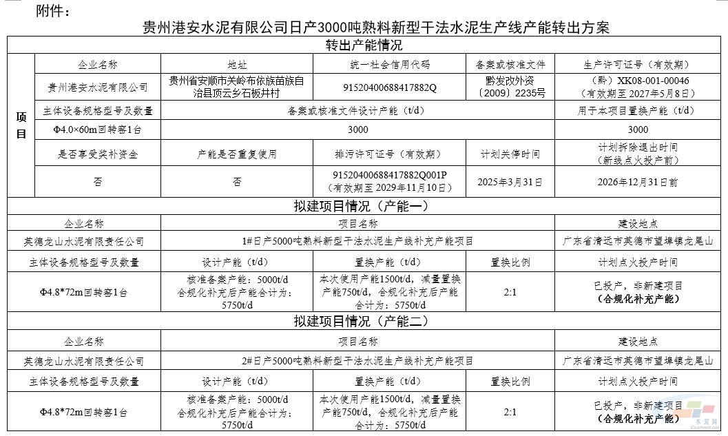 11月10日,贵州省工业和信息化厅发布《关于贵州港安水泥有限公司日产3000吨熟料新型干法水泥生产线产能转出方案的公示》,该生产线产能指标将转让至英德龙山水泥两条5000t/d熟料生产线,置换比例2:1。